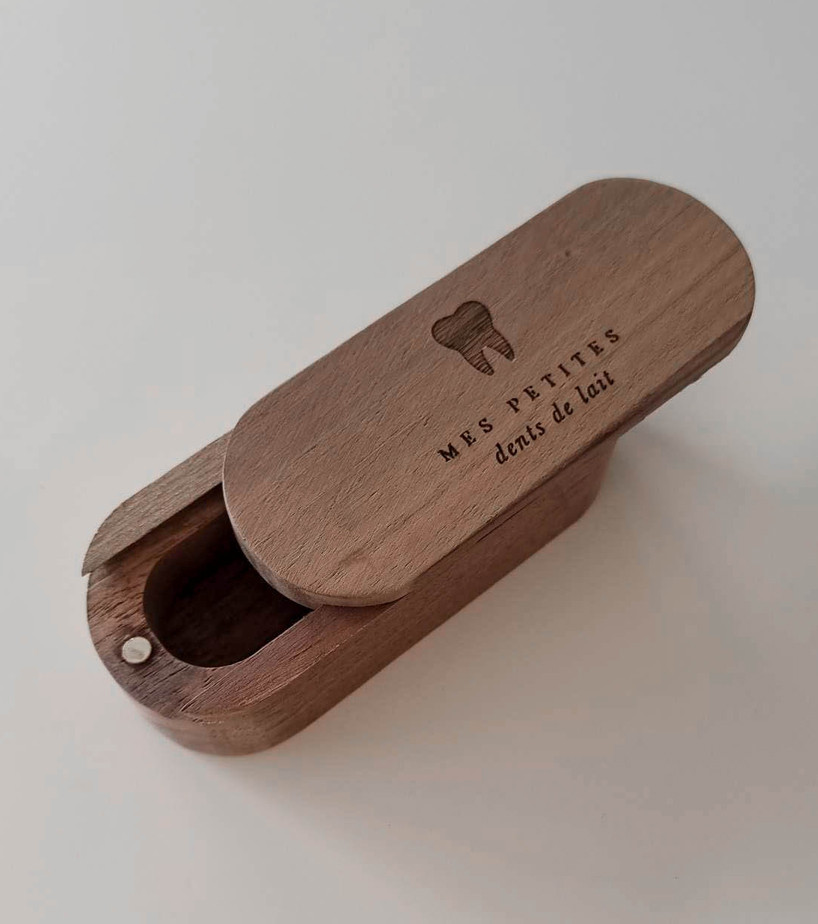 La boite à dents de lait Zakuw en noyer massif, vous permettra de conserver précieusement les dents de lait de votre enfant.