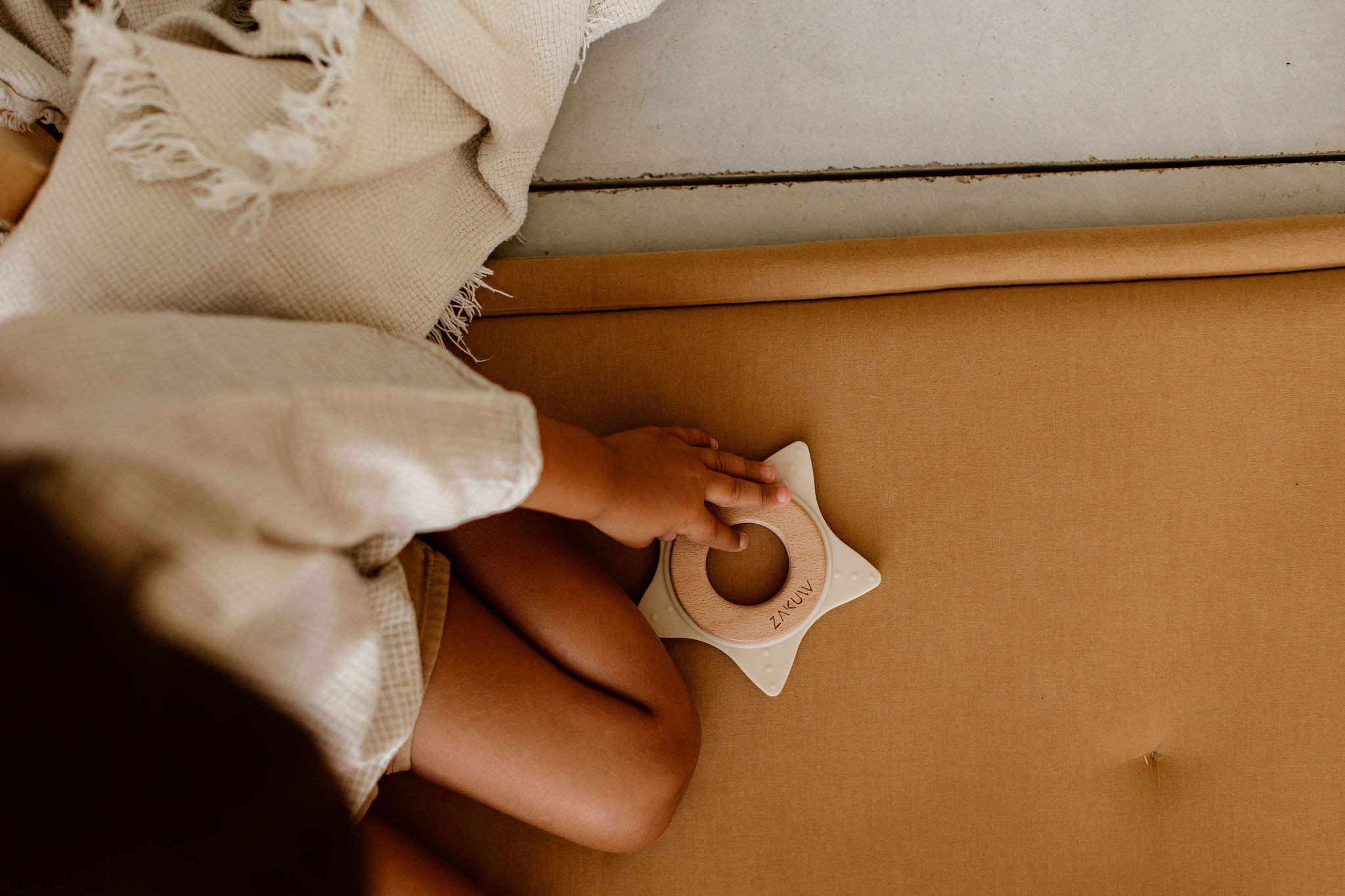 Composé de bois de hêtre et de silicone alimentaire, notre anneau de dentition “Étoile” soulagera votre bébé lorsqu’il commencera à faire ses dents