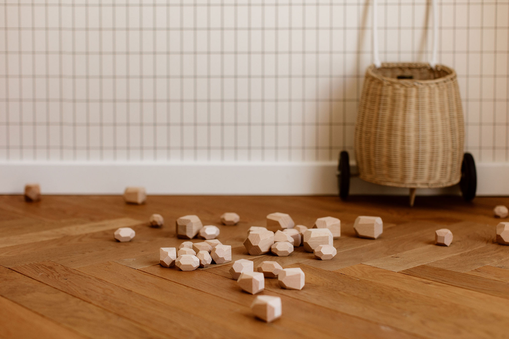 Les enfants sont libres de jouer comme ils l’entendent avec les 20 rochers empilables en bois naturel.